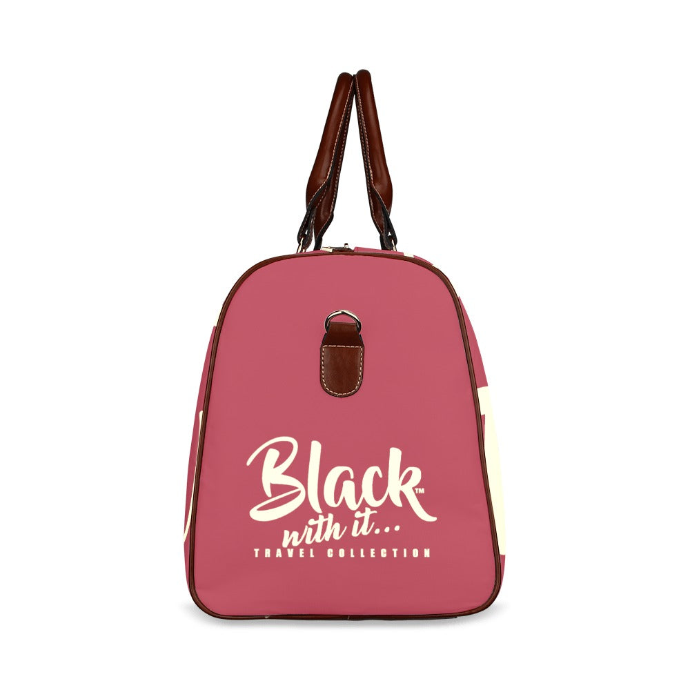 BWI: Luxury Travel Bag: Crimson w/ Cream Font - Brown Leather Straps Large-Waterproof (Model 1639) Waterproof Travel Bag/Large (Model 1639)