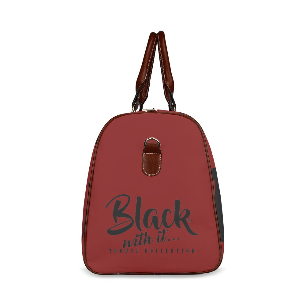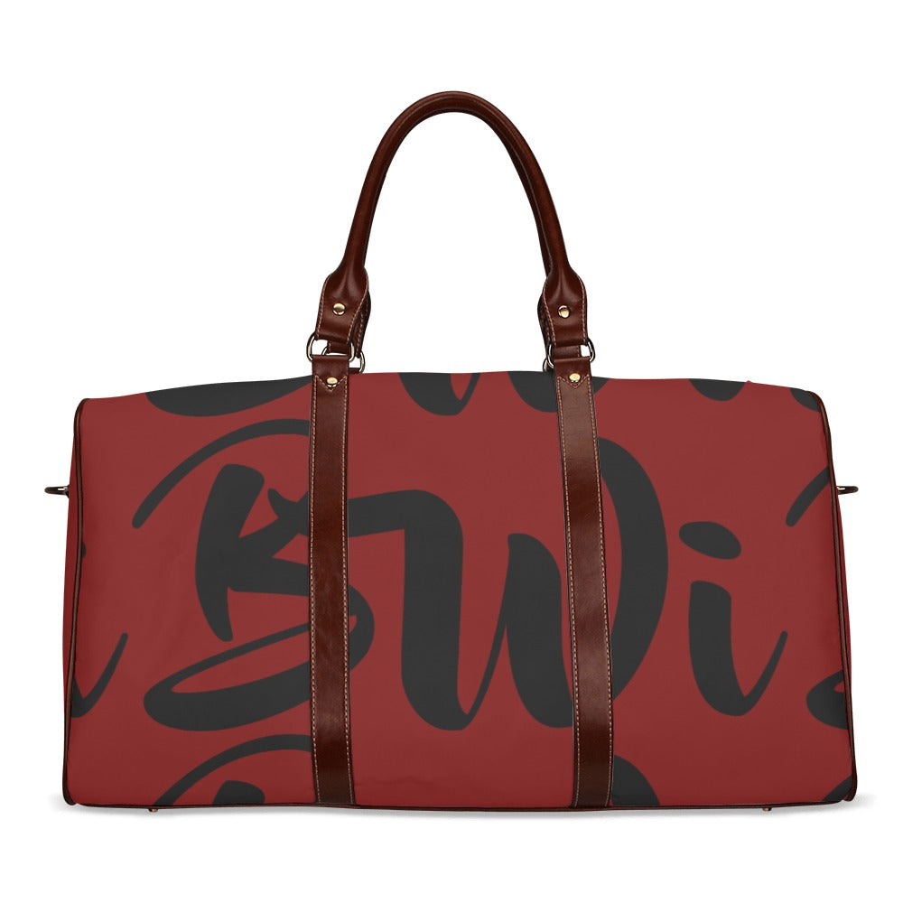 BWI: Luxury Travel Bag: Maroon w/ Black Font - Brown Leather Strap Waterproof Travel Bag/Large (Model 1639)