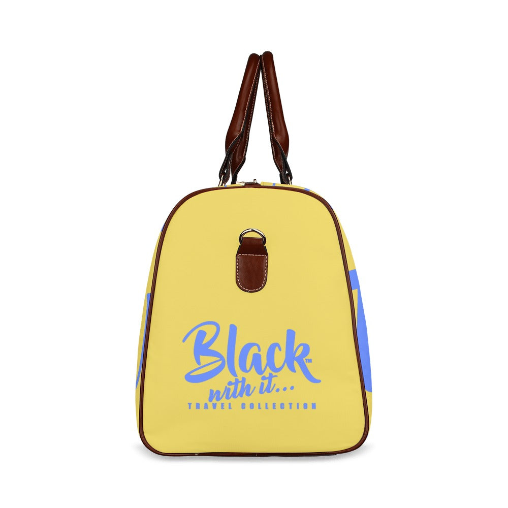 BWI: Luxury Travel Bag: Old Gold w/ Royal Blue Font - Brown Lether Straps Waterproof Travel Bag/Large (Model 1639)